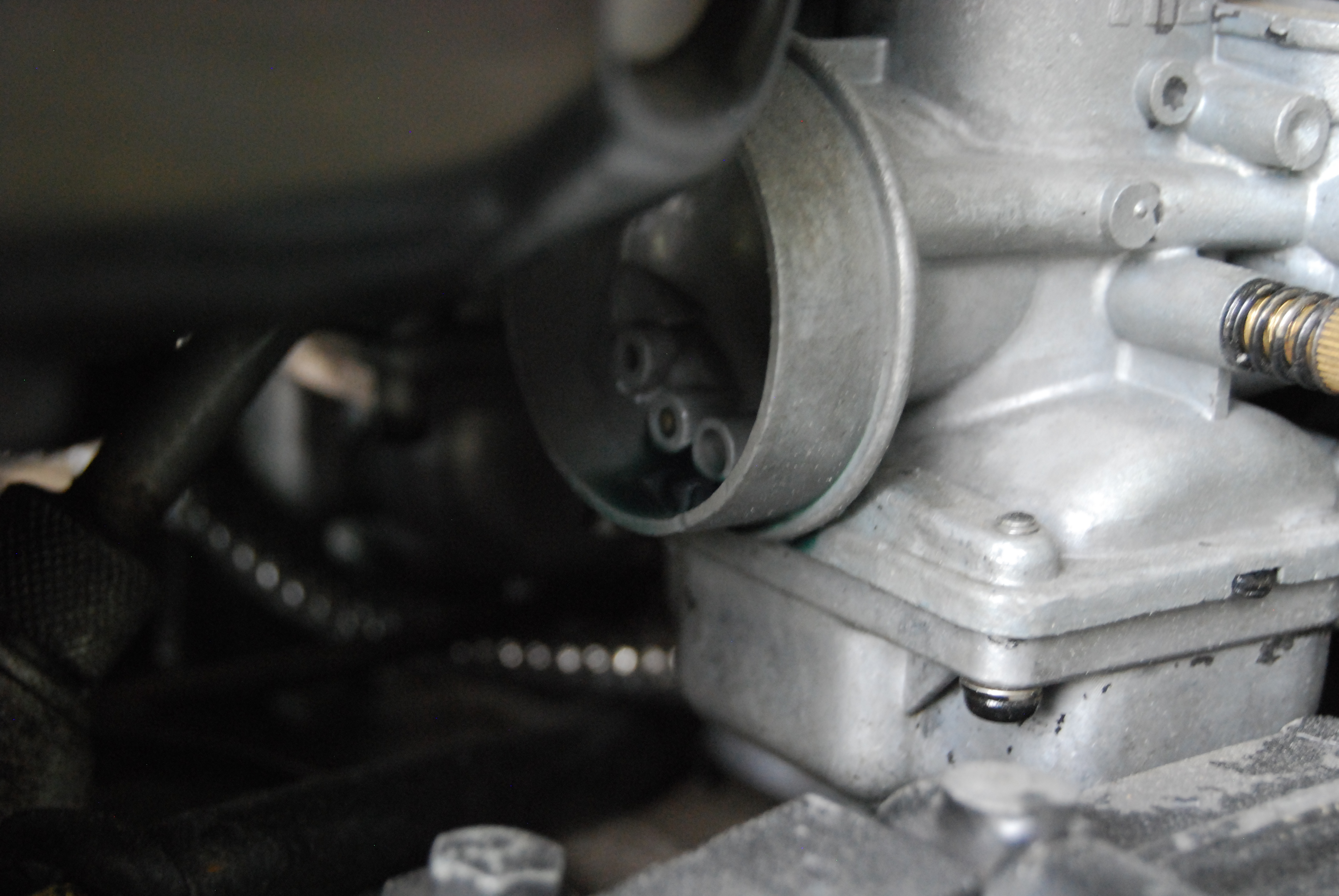 When I bought the bike, the pod filter for the right carburetor was removed. After running it for a little bit I noticed some fuel puddling at the air intake. My assumption is that something with the floats is messed up, and we’re letting too much fuel into the float chamber. That might be why the filter had been removed, in a symptom-fix for the air/fuel ratio.
