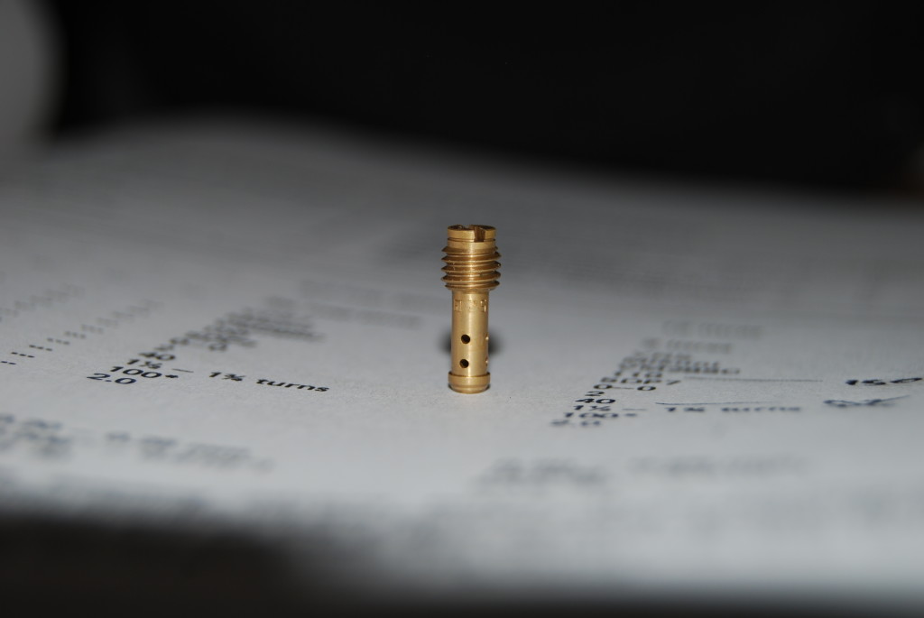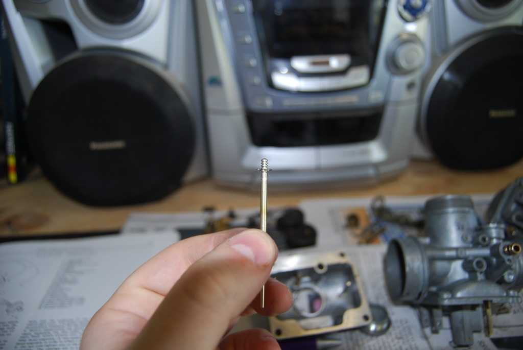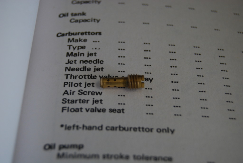 The jets in this bike don’t match the manufacturer stock specifications. I’m not really surprised, the PO mentioned he re-jetted the carbs in an effort to fix the fouling issue. And I’ll likely have to re-jet, especially after I start messing with the exhaust. But for now, the pilot jet is a size 25 VM22/210 (stock is size 40), and the main jet is sized at 150 (not sure what model jet it is, stock size is 110). The jet needle (long, thin piece from the throttle valve assembly) is a 5I4 (stock is 5DP7). Circlip is on the 2nd from the bottom notch.
