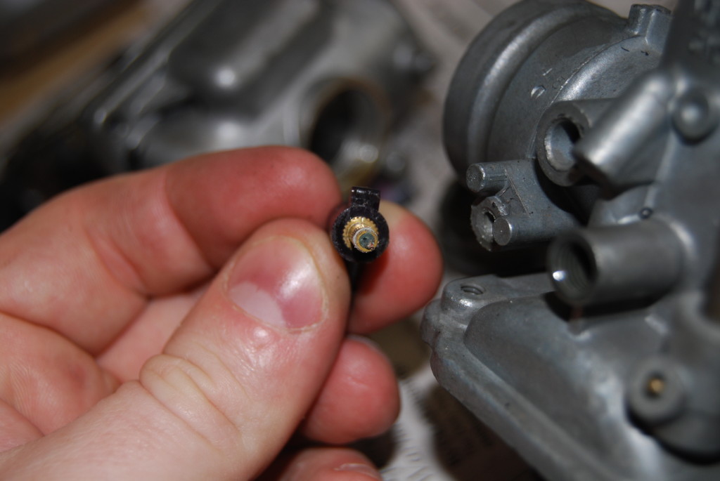 Another interesting thing to note. This bike runs pre-mix, despite having an oil pump for oil injection. When I asked the PO about it, he could only tell me that it had been ‘disabled’. I wasn’t sure whether that meant the pump had just stopped working, or if something had been physically done to disable it. Well, I (kinda) got my answer when inspecting the carbs. Each carb has a nylon nozzle that had lines going to the oil pump. They are press-fit into place, so some careful screwdriver-ing (yes, a technical term) and they pull free. In both carbs these had been plugged with what looked like a small piece of wire and some silicon. So the pump may still work (TBD), but there’s no way I’ll be getting oil to the carbs without replacing these nozzles.